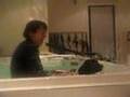 De honden worden eerst onder een warme douche gezet. Lekker de spieren vast een beetje opwarmen. Daarna werden ze door Monique in het water getild. Voor de zekerheid krijgen ze een zwemvest aan.